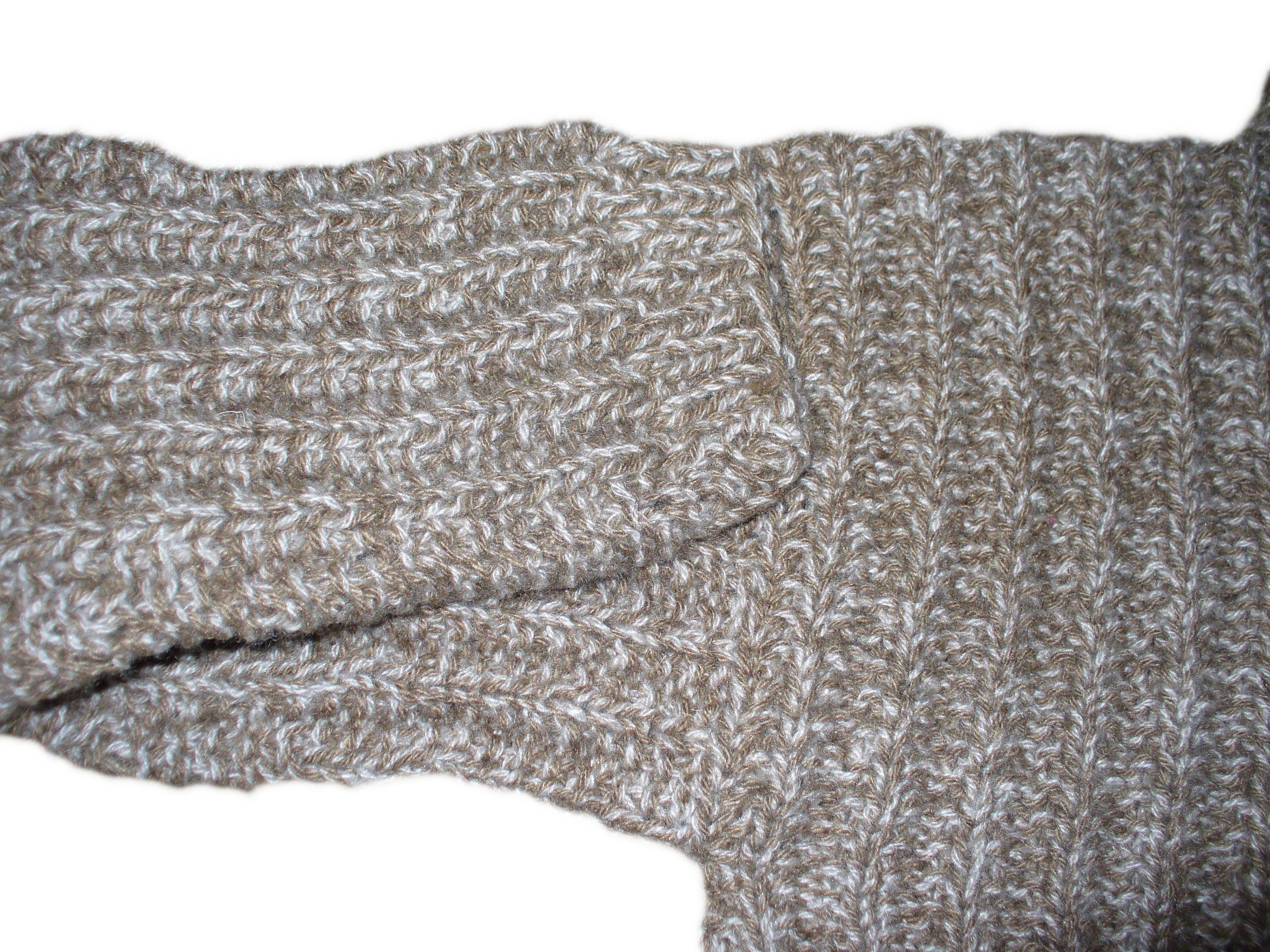 Свитер "Брат" ручной английской вязки спицами в 4 нитки - белая и бежевая нитки скручены по 2. Прямой силуэт, отложной воротник, декоративная пуговица, втачной спущенный рукав. Свитер очень теплый, вязка плотная. Состав пряжи - 50% овечья шерсть, 50% акрил. Длина изделия для размеров 46-58 - 70-75см.