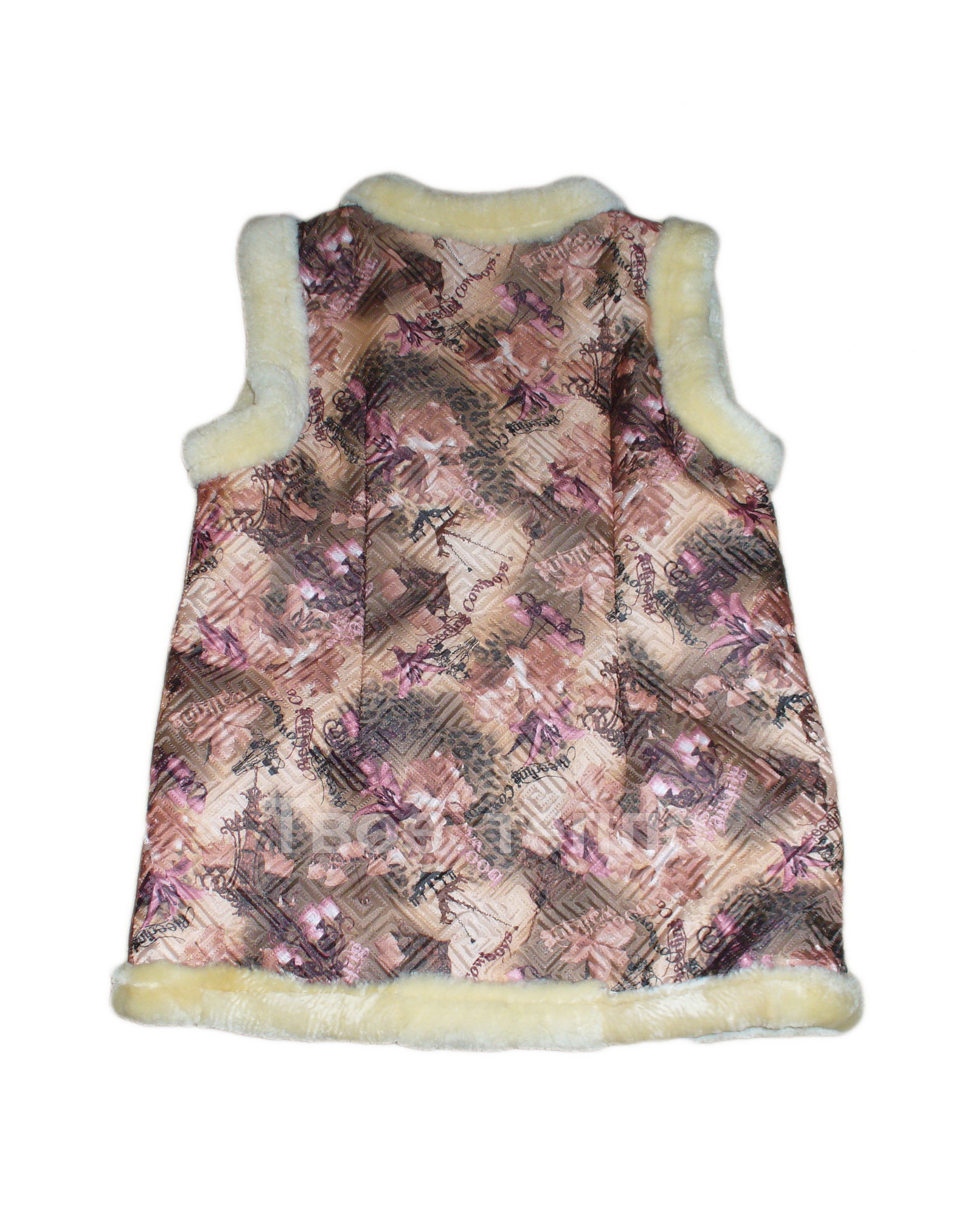 Женский жилет на овчине, покрыт шелковистой стеганой тканью синего цвета. Жилетка с двумя накладными карманами, на 2х пуговицах. Внутри подкладка из натуральной кусковой овчины сливочного цвета. Опушка - натуральный мех.