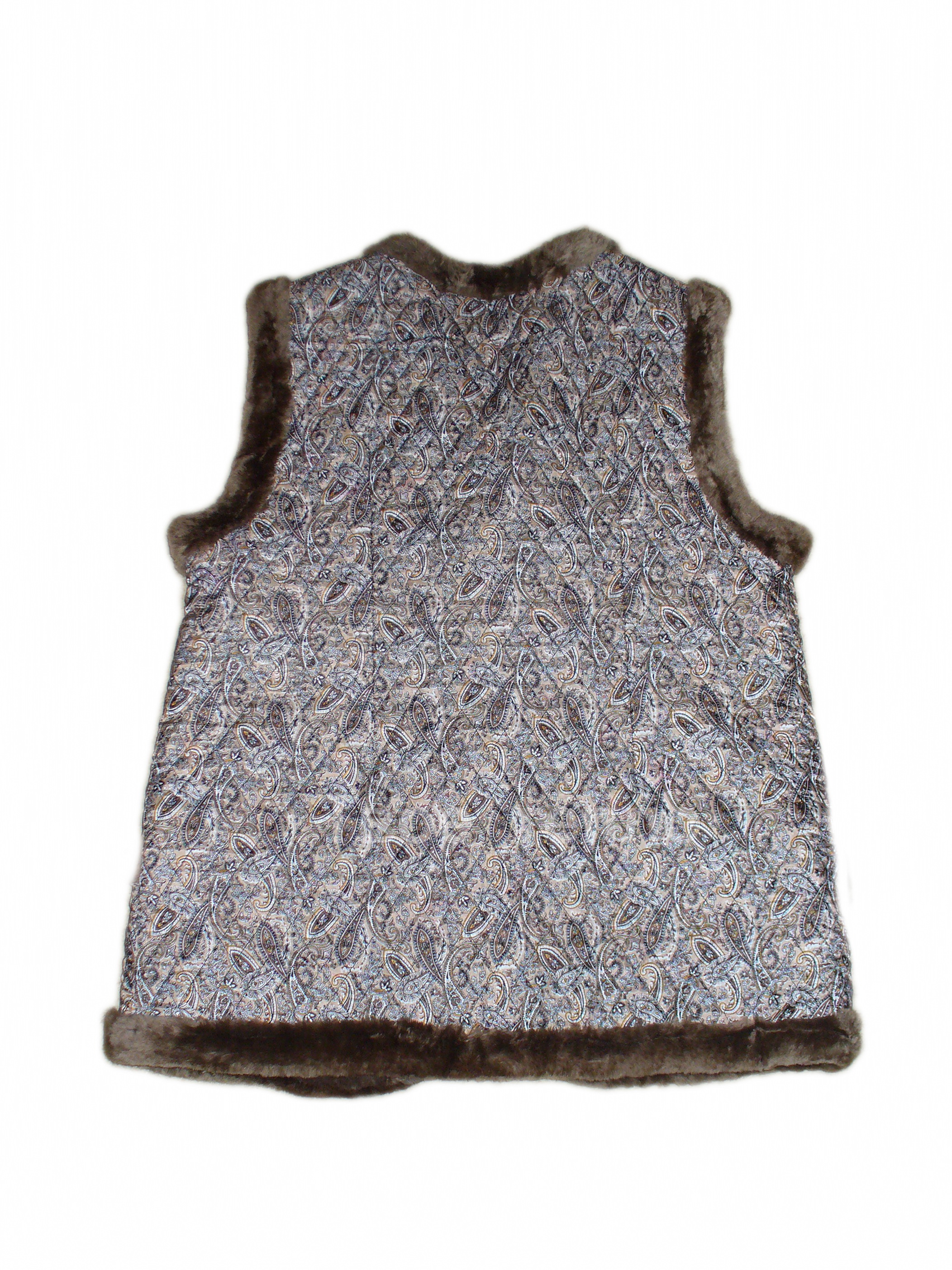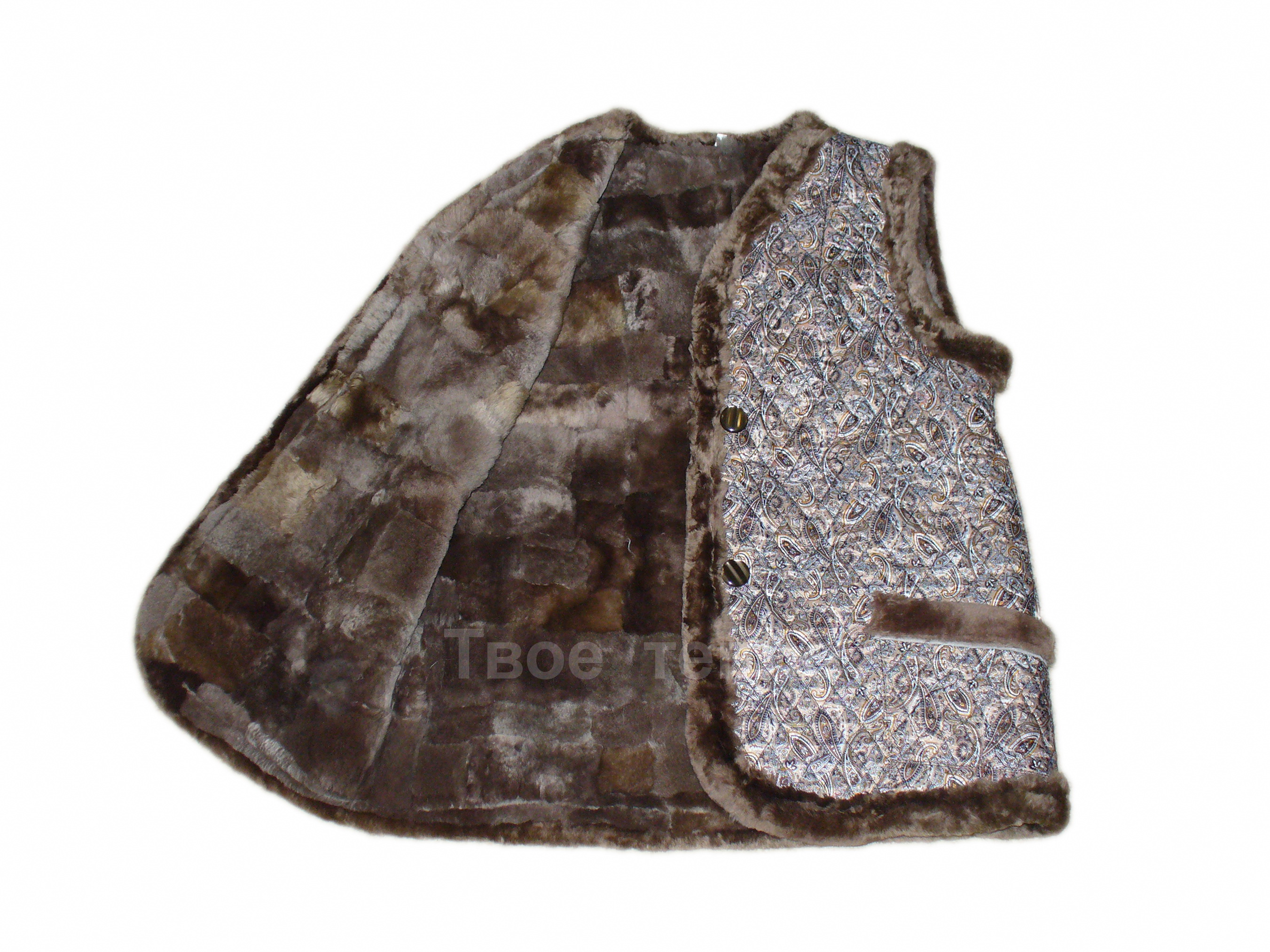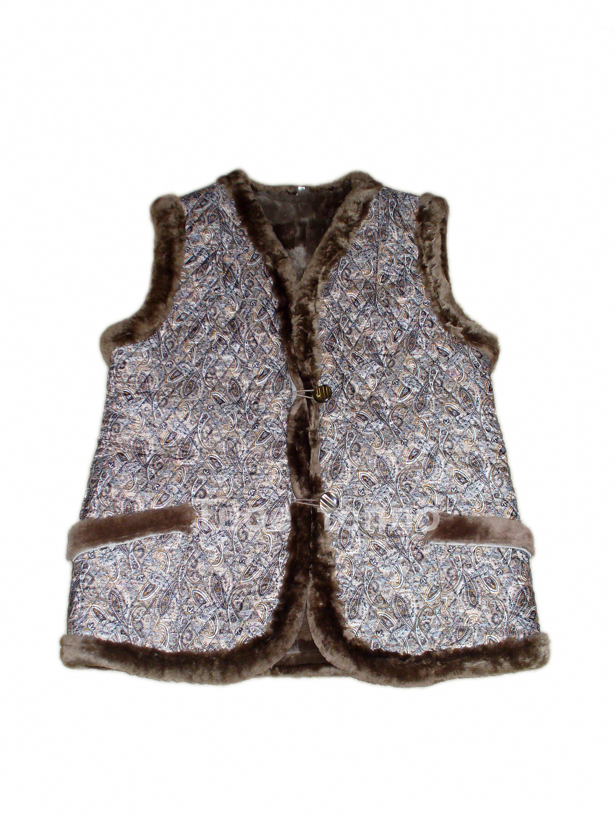 Женский жилет на овчине, покрыт шелковистой стеганой тканью бежевого цвета с рисунком. Жилетка с двумя накладными карманами, на 2х пуговицах. Внутри подкладка из натуральной кусковой овчины коричневого цвета. Опушка - натуральный мех.