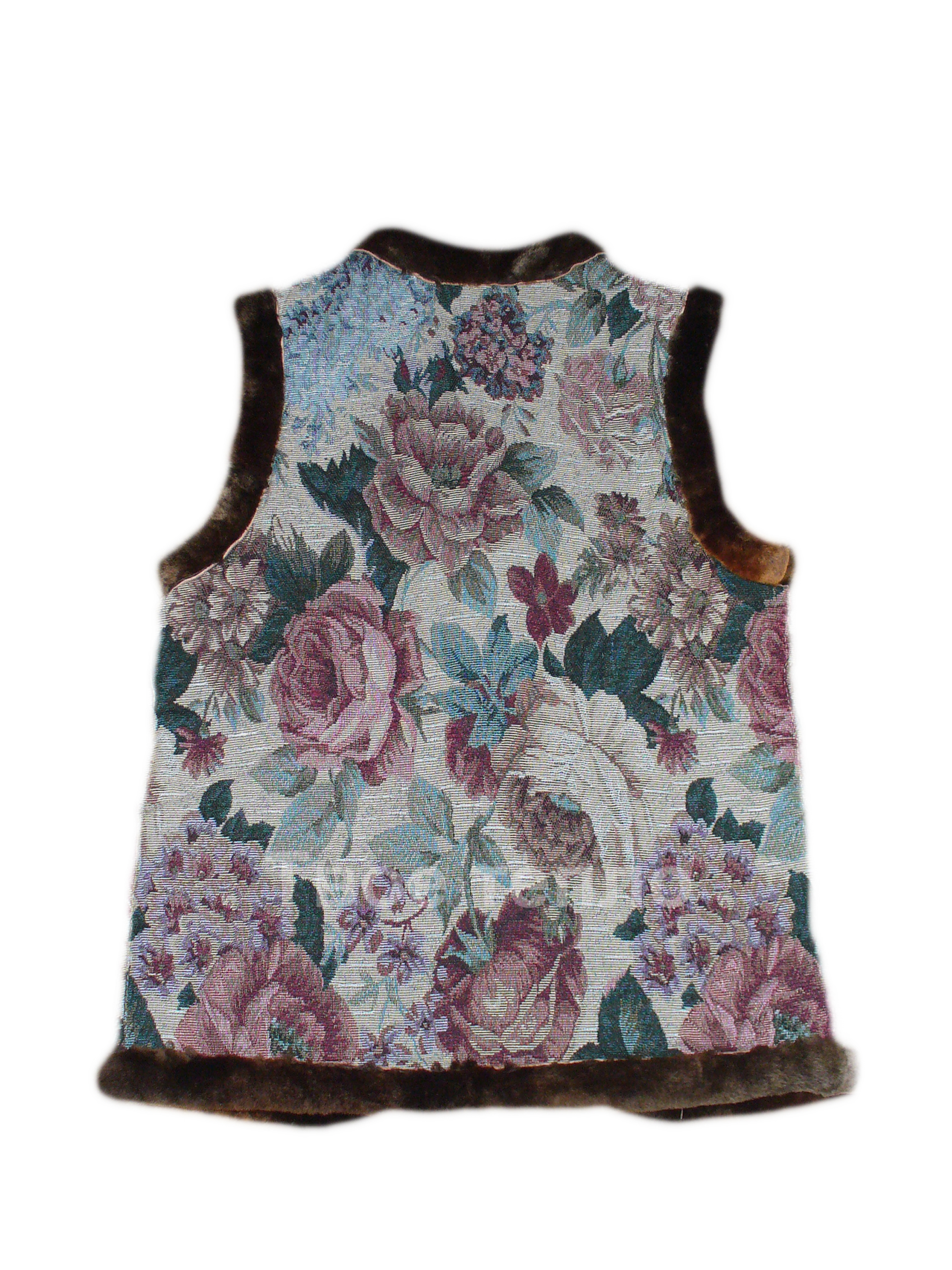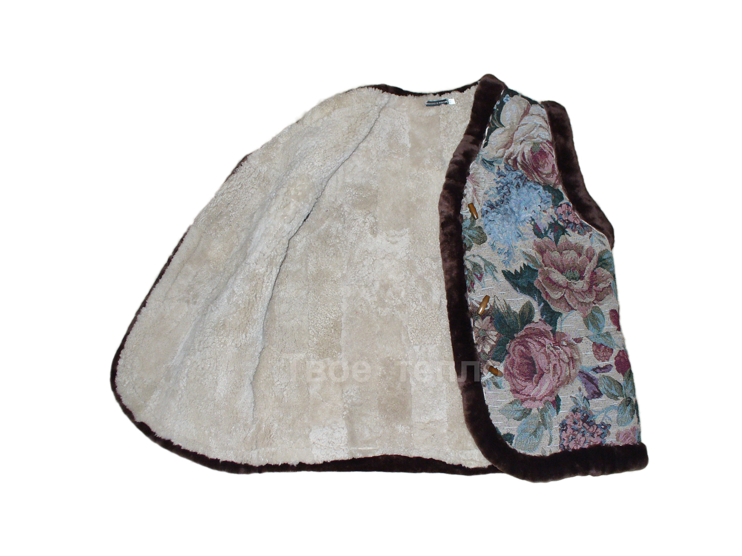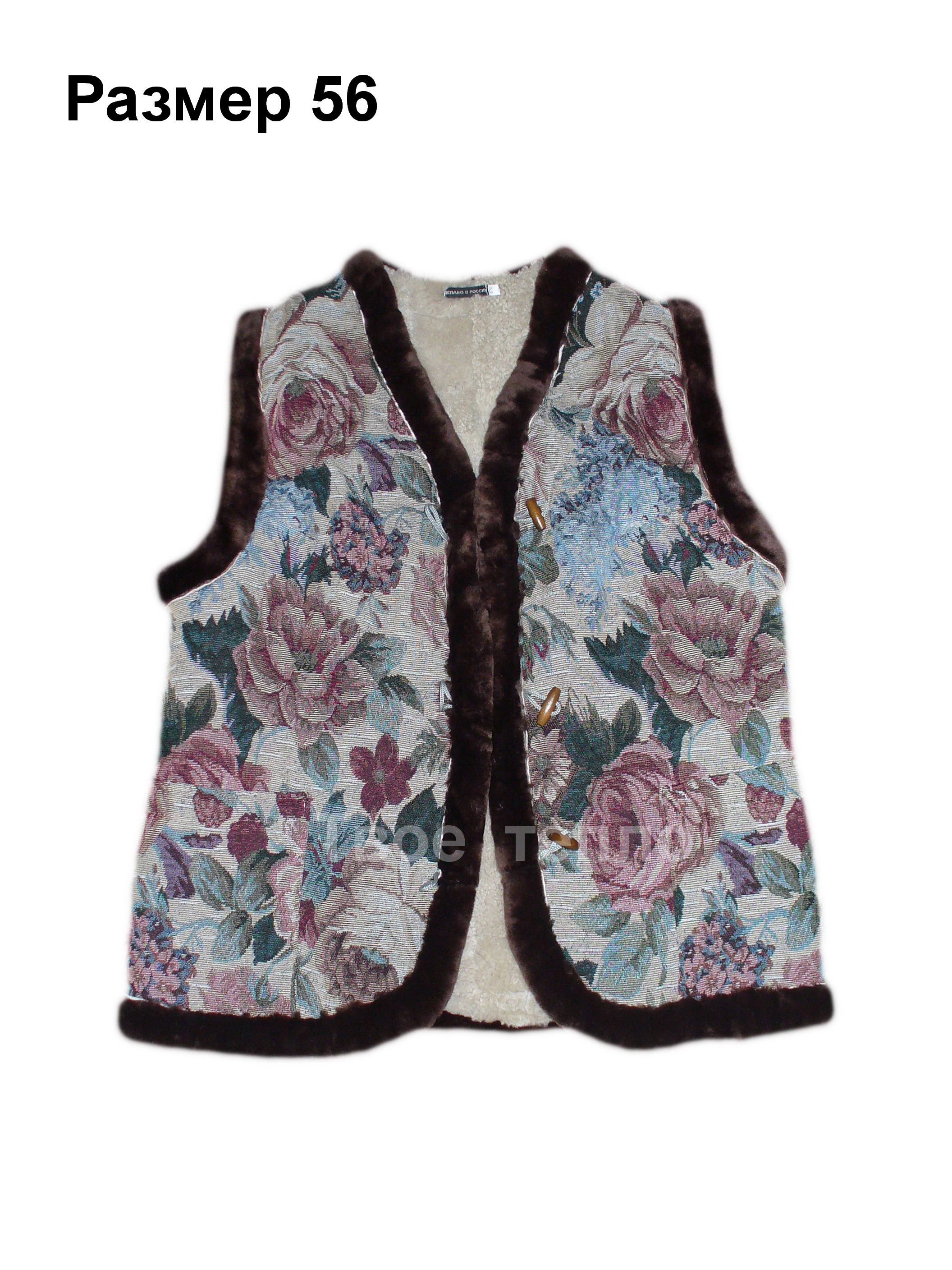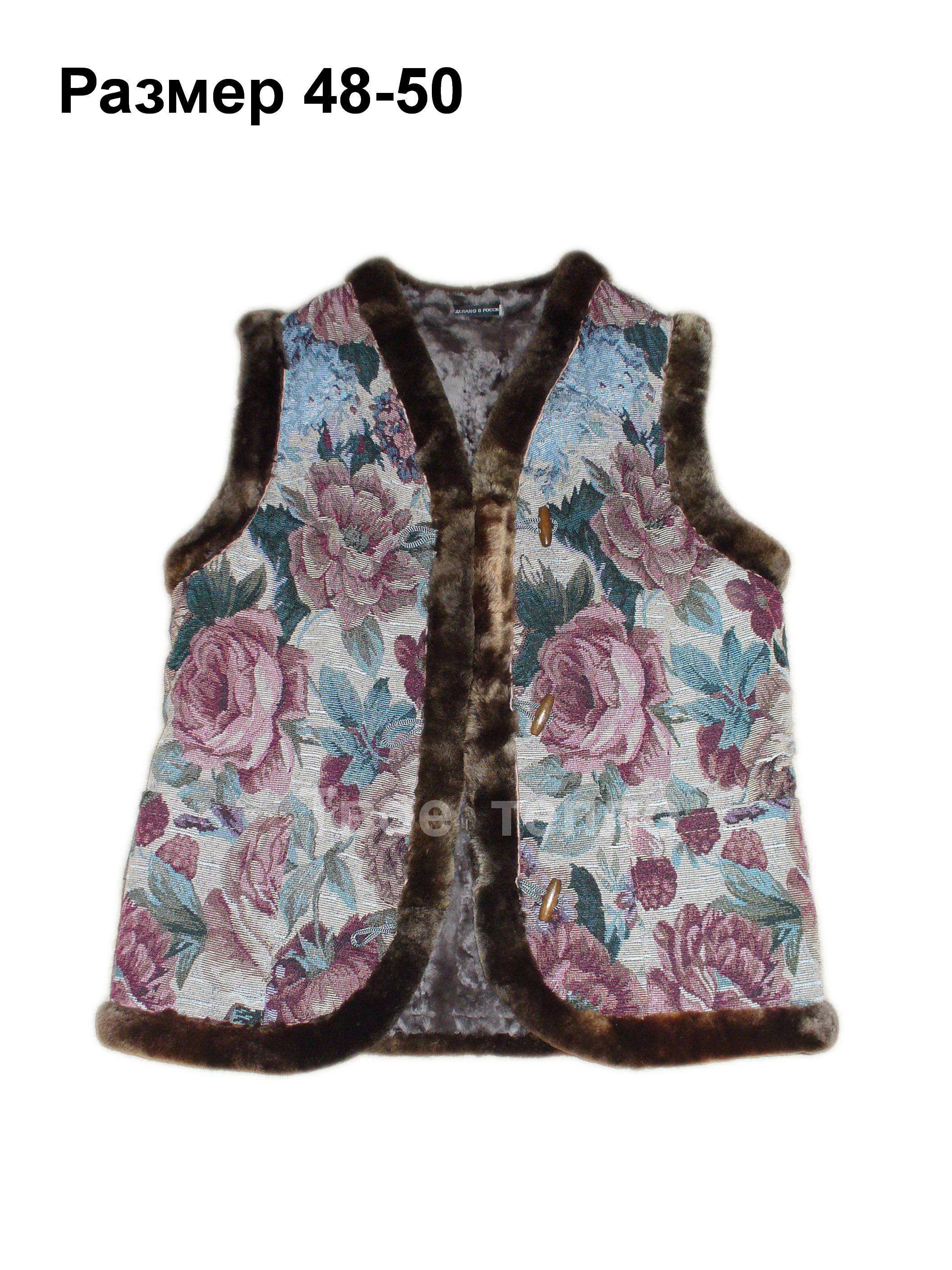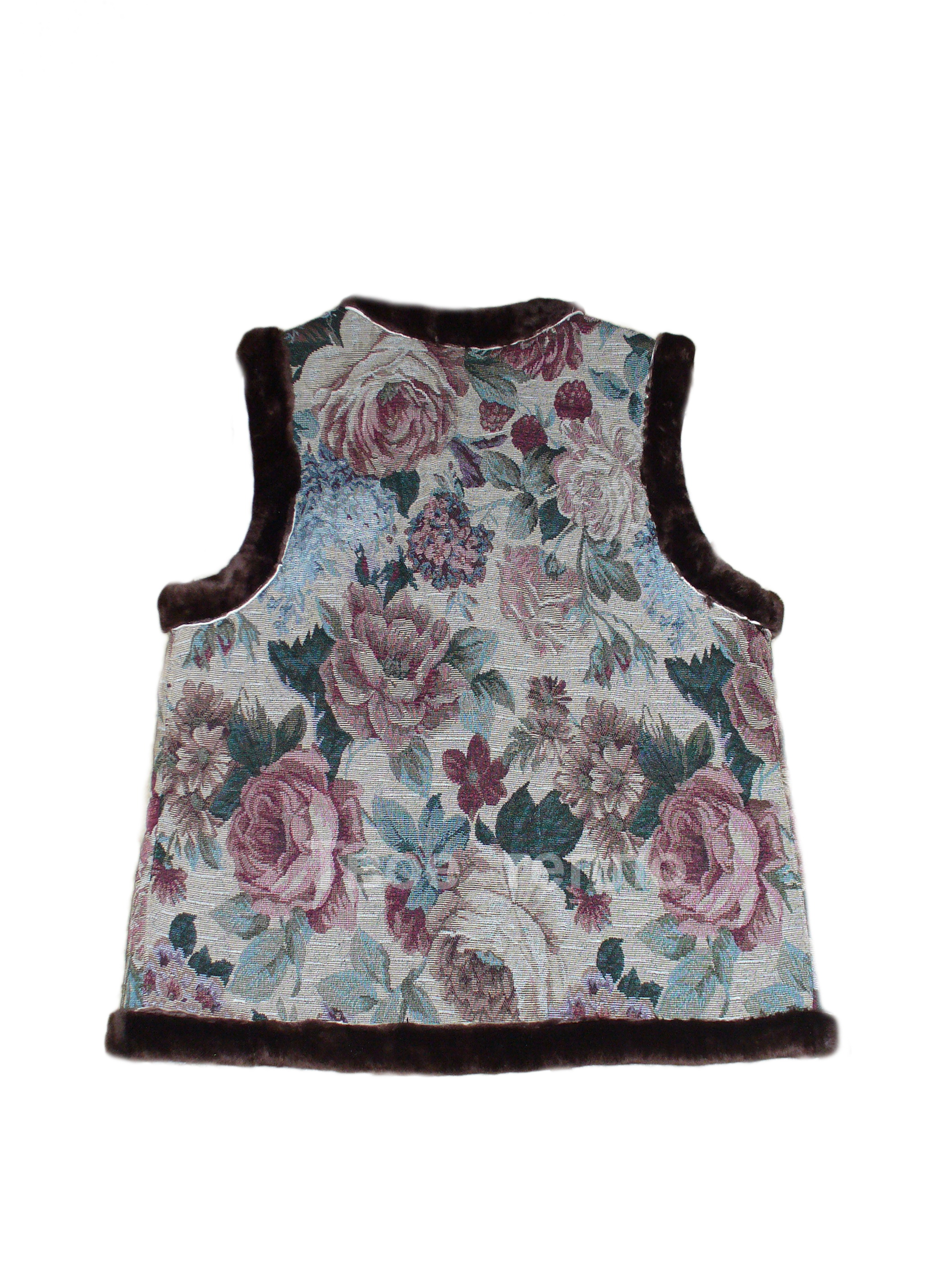 Женский жилет на натуральной кусковой овчине, покрыт гобеленовой тканью с цветочным рисунком. Жилетка приталенная, с двумя накладными карманами, на 3х пуговицах. Опушка - натуральный мех коричневого цвета. Внутри подкладка из натуральной кусковой овчины бежевого или коричневого цвета.