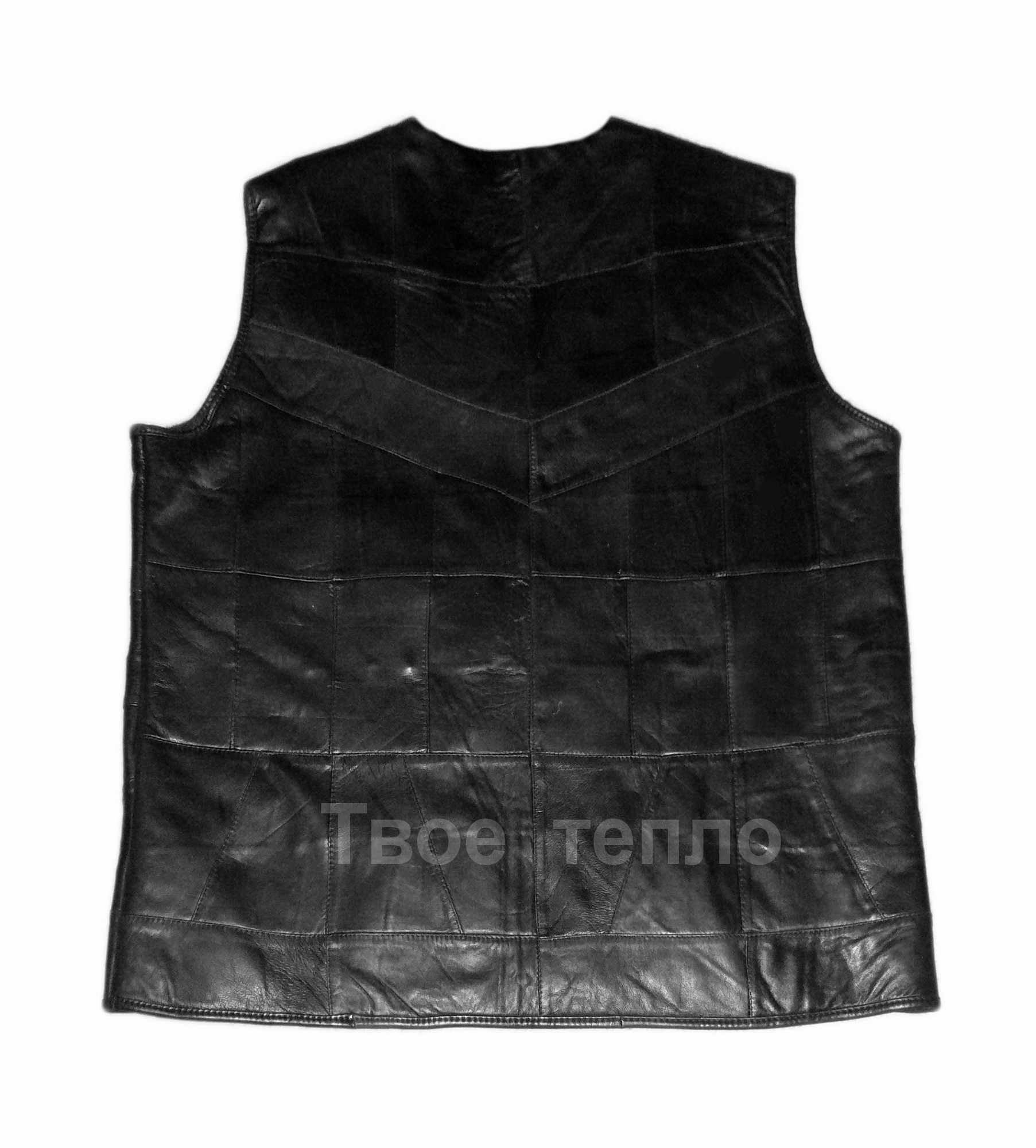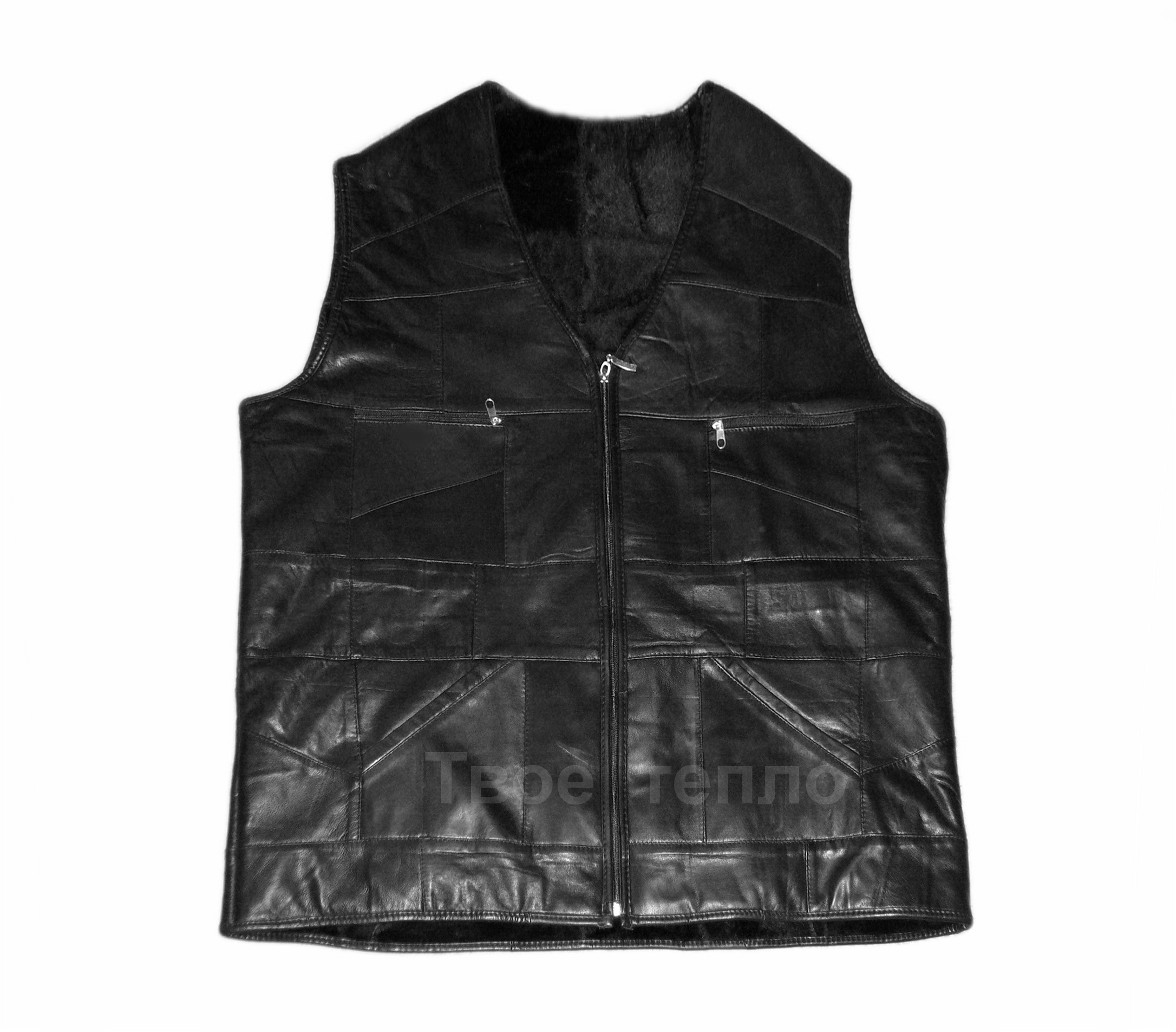 Мужской кожаный жилет с подкладкой из овчины размер 3XL. Верх изготовлен из мягкой кусковой кожи черного цвета. Внутри подкладка из натуральной кусковой овчины. Прямой силуэт, на молнии, с карманами. Два боковых накладных кармана, два нагрудных прорезных кармана на молнии, один внутренний карман. Цвет кожи: черный.