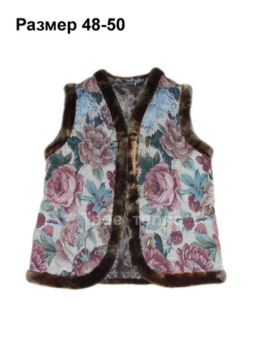 Жилет на овчине, покрыт гобеленовой тканью с цветочным рисунком. Приталенный покрой, с накладными боковыми карманами, на 2х пуговицах. Внутри подкладка из кусковой натуральной овчины фабричной выделки (шкура) светлого цвета.